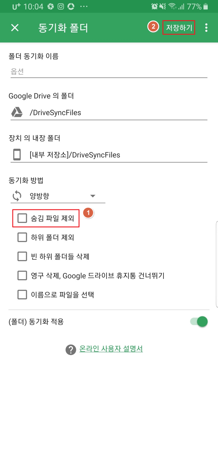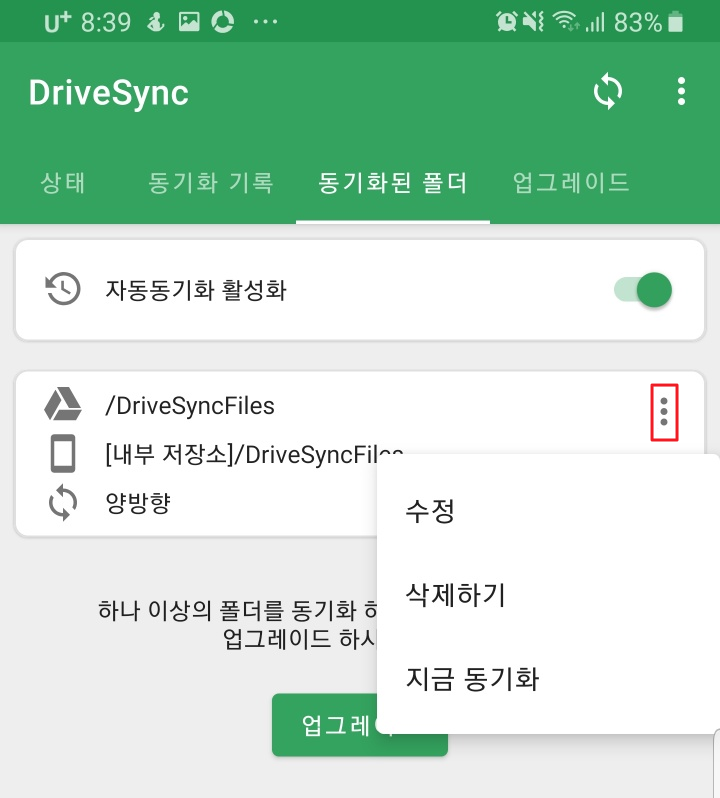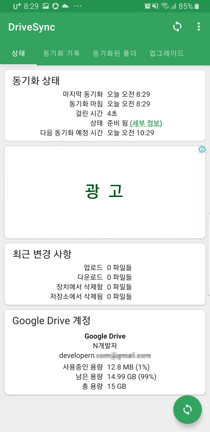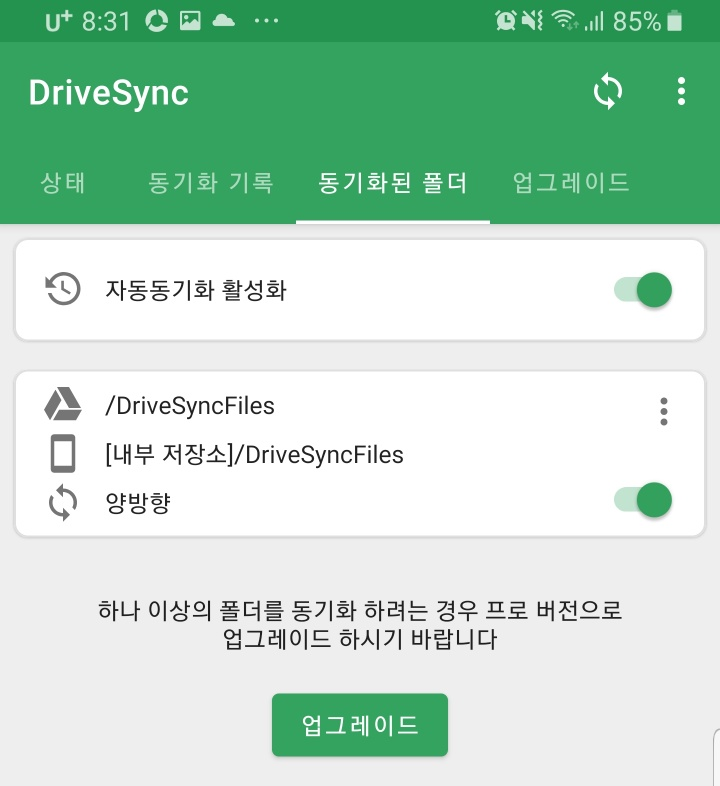6. 동기화된 폴더 탭을 선택해면 현재 동기화된 폴더 이름을 확인할 수 있습니다. 폰에도 생성되어 있는지 탐색기 등으로 드라이버가 생성되어 있는지 확인해 봅니다. PC에서도 구글 드라이버에 저장소가 생성됬는지 확인합니다.