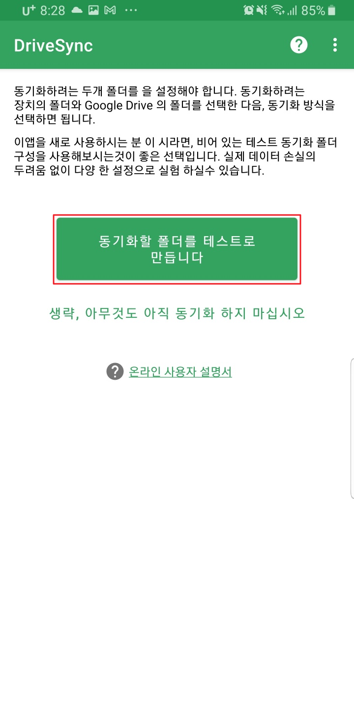4. 동기화할 대상을 선택하여 주십시오 버튼을 클릭합니다. 다음 창이 나오면 동기화할 폴더를 테스트로 만듭니다 버튼을 클릭합니다. 폴더를 생성을 위해 잠시 기다려 줍니다.