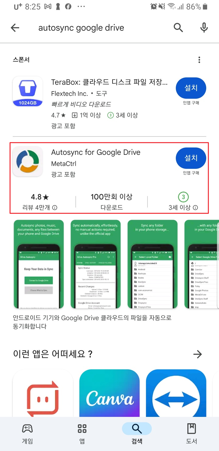 1. 안드로이드 폰에 Autusync for Voogle Drive를 설치합니다. Play 스토어에서 Autusync for Voogle Drive를 검색한 후 다음 앱을 설치해 줍니다.