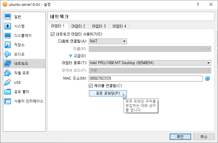 VirtualBox에 설치되어 있는 리눅스 서버에 SSH로 접속하기 위해서는 "포트 포워딩"작업을 해주어야 한다.