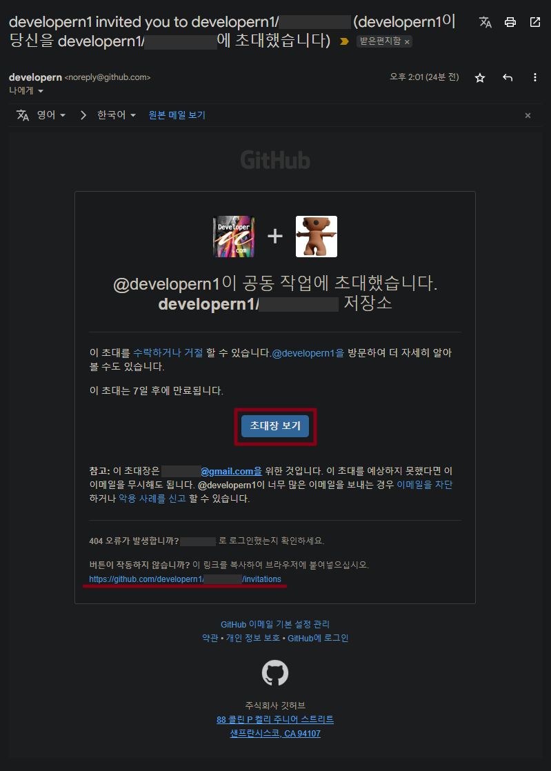 1. 누군가가 저장소를 공유하게 되면, 공유 받은 사람에게 다음과 같은 메일이 도착합니다.