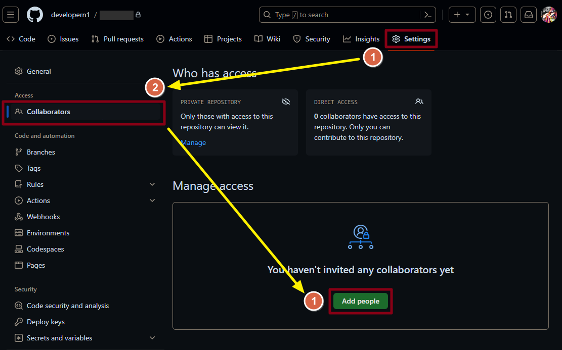 1. 먼저 Private 저장소를 선택하고 Settings에서 Collaborators 를 선택해 줍니다.