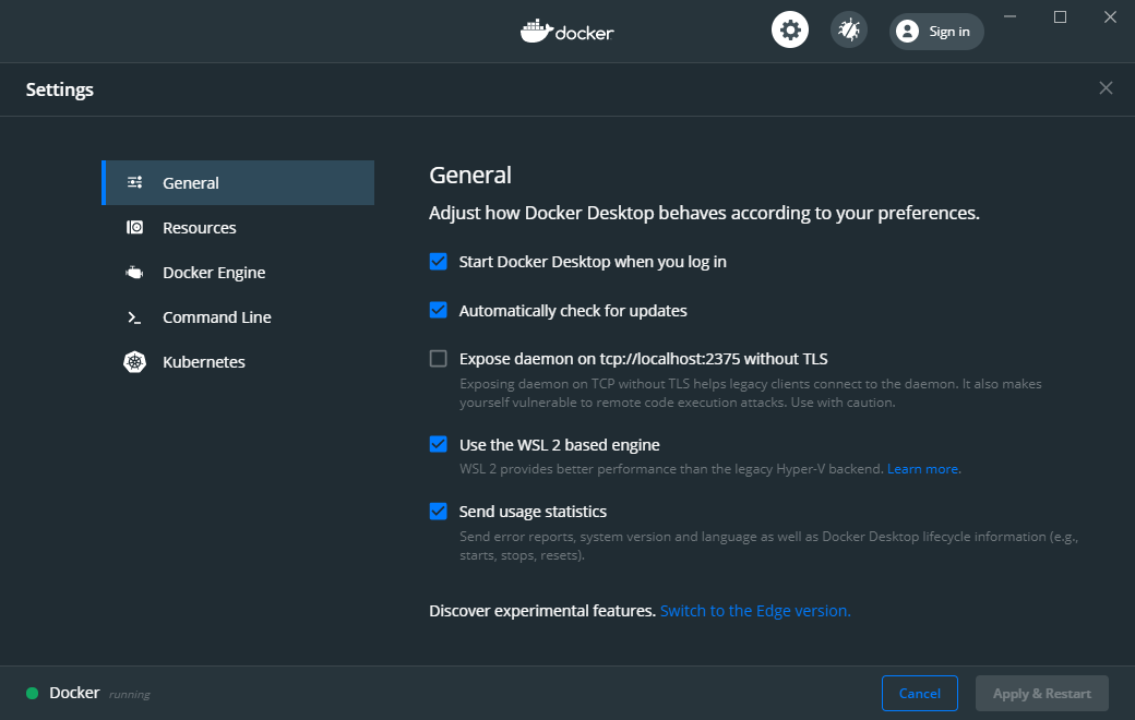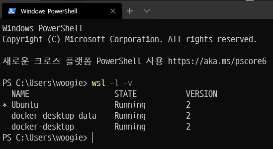 이전에 보이지 않던 docker-desktop-data와 docker-desktop이 설치되어 있고 현재 실행 중임을 확인할 수 있다.
