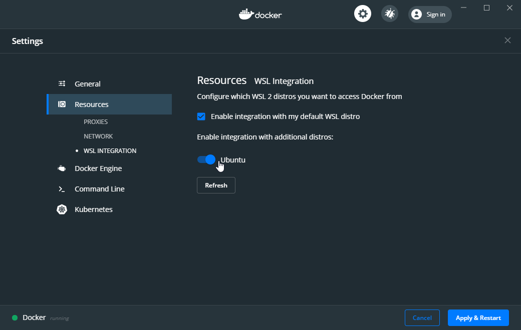 다음으로 화면 왼쪽에서 Resources의 WSL INTEGRATION을 선택한다.