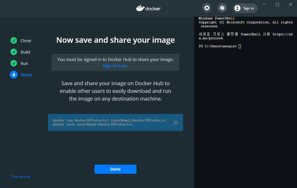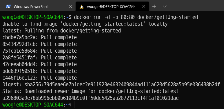 7. 이제는 docker의 실제 동작을 확인할 차례다. 4번항에서 복사해둔 명령어를 shell에 붙여넣기 하고 실행한다.