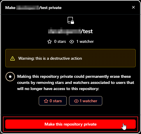 5. 메시지를 클릭하고 나면 첫 번째 팝업창이 나타납니다. 이 창에서 아래쪽에 있는 I want to make this repository private 버튼을 클릭합니다.