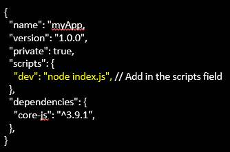위 명령으로 package.json파일이 생성되면 위의 2번째 방법에서와 같이 script에 "dev": "node index.js", 를 추가해 줍니다.