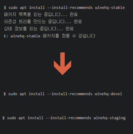 wine을 설치할 때 사전 작업을 모두 마치고 설치를 진행 하기 위해 다음 명령을 실행하면 오류가 발생하는 경우가 있습니다.